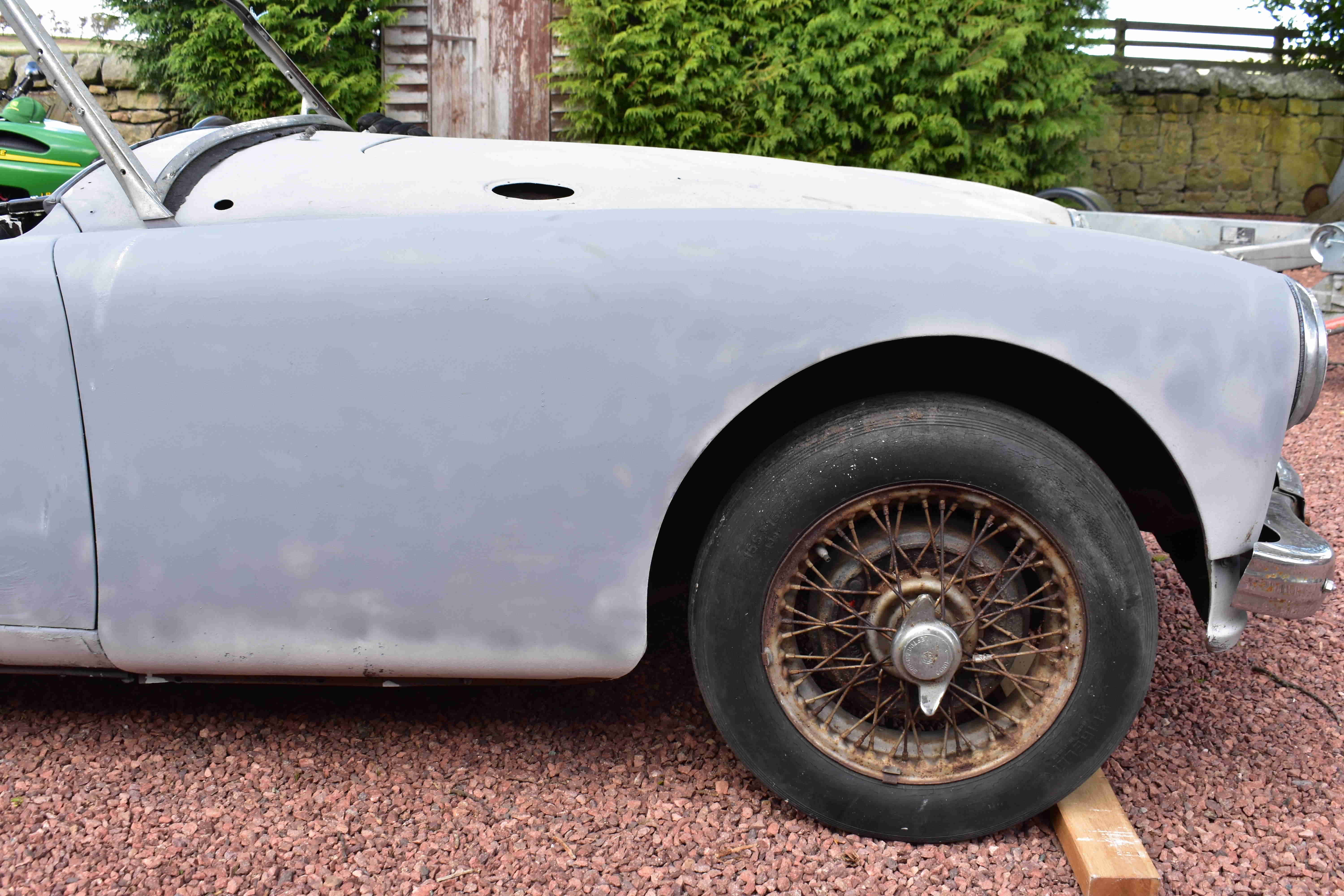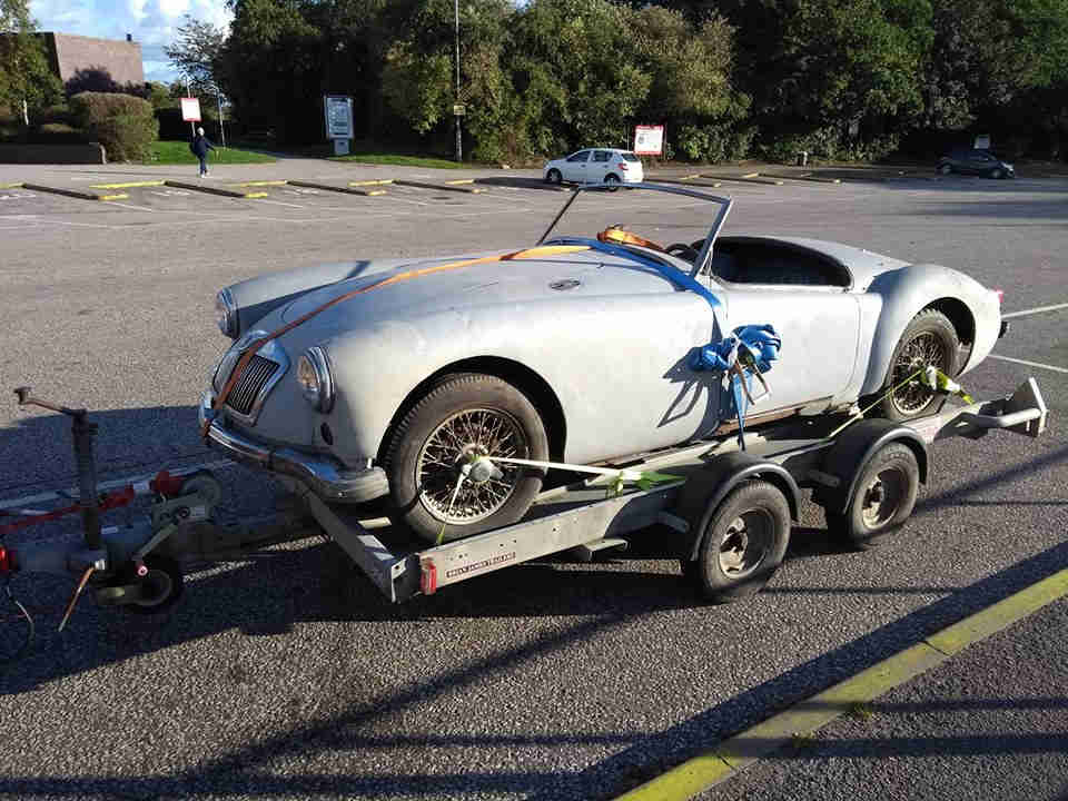 The day finally arrived when I borrowed a car trailer from a friend so Mary & I headed off, across the Pennines, to Manchester to collect Maggie, the MGA. Once we found the address (with a challenging house numbering system) we could see the car looking forlorn in the drive, with another immaculate MGA in the garage and an E Type under restoration - we'd take her to a better place. The journey home was uneventful (once the ratchet straps were readjusted) and she was introduced to her new home in Chatton.