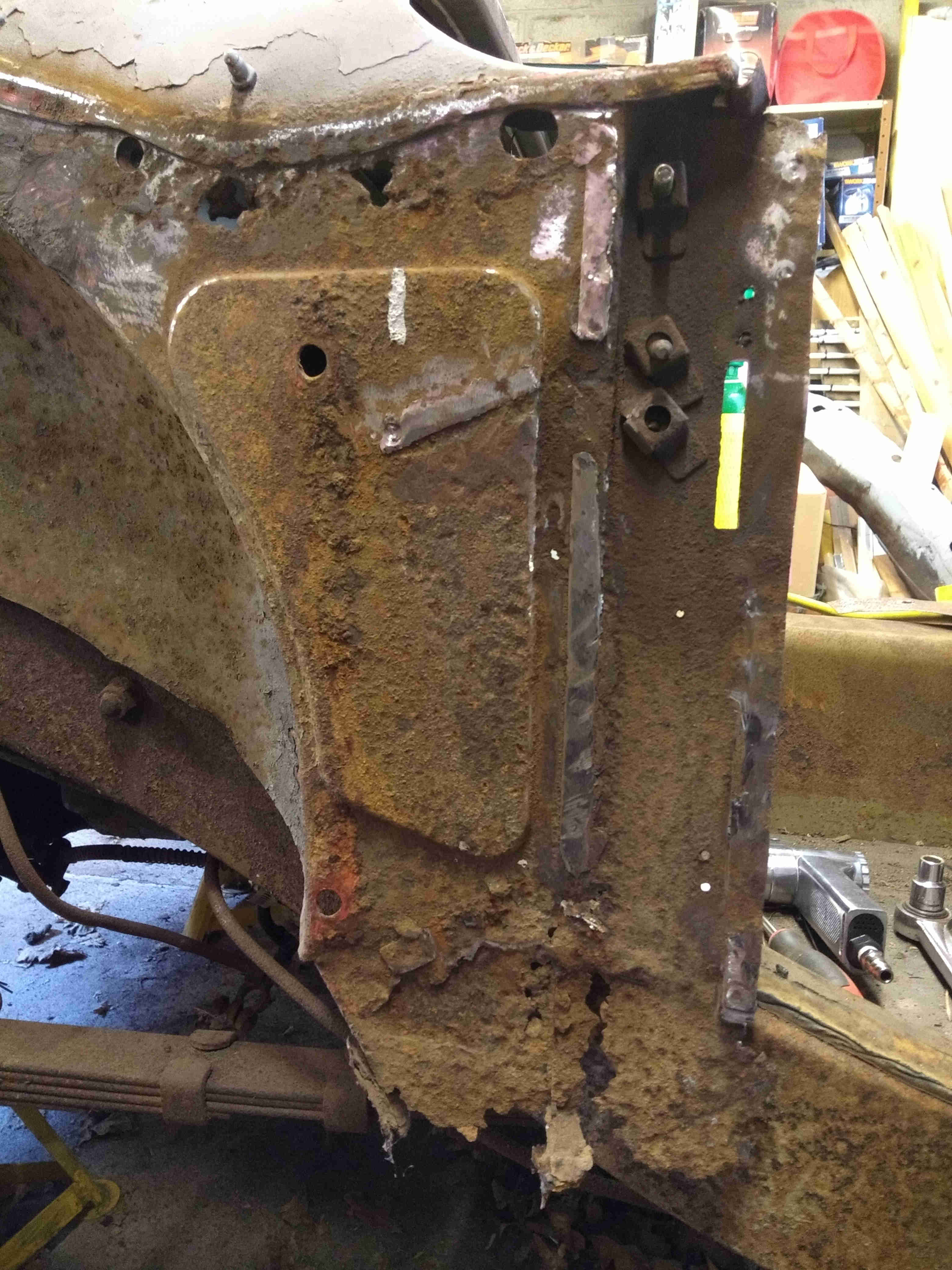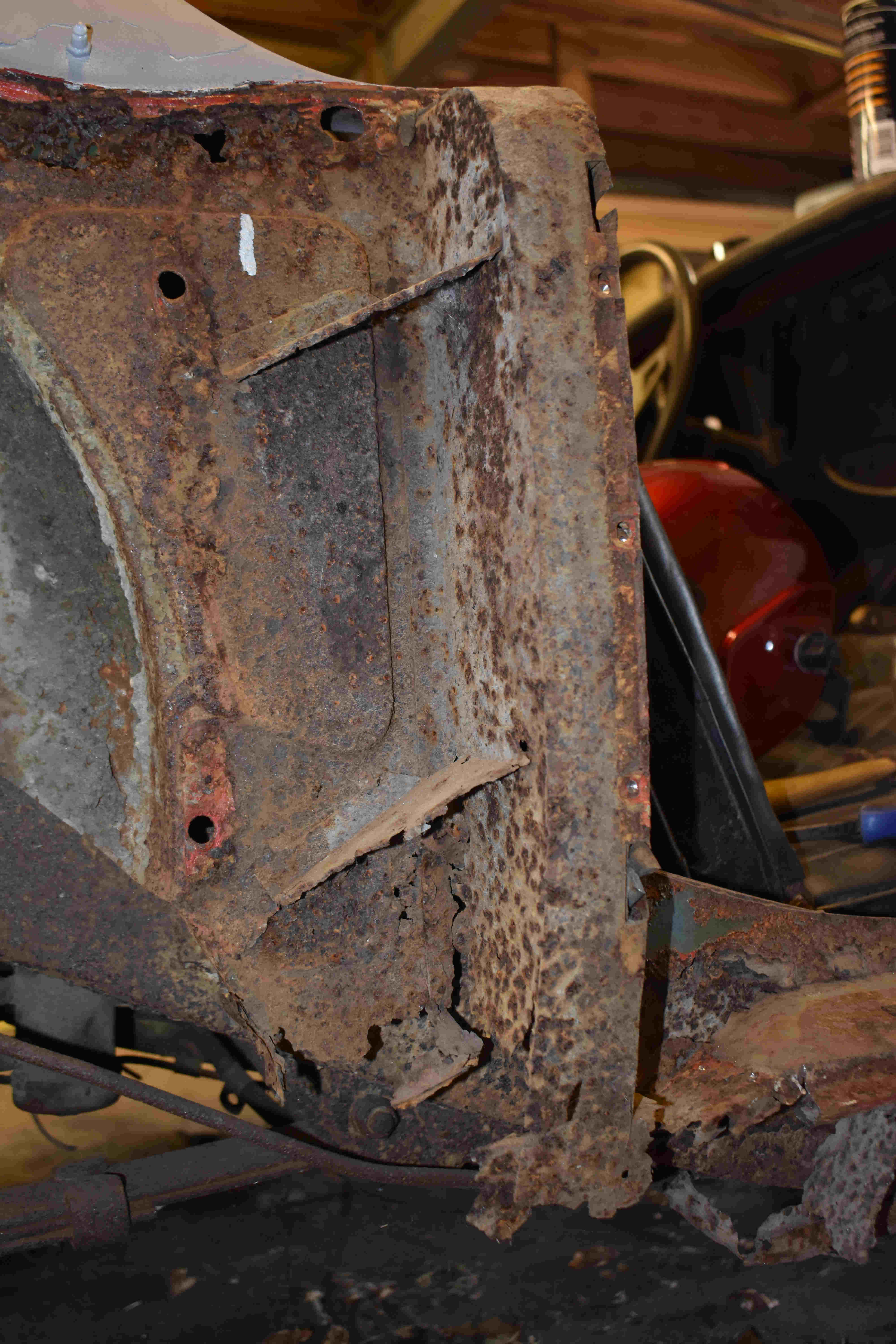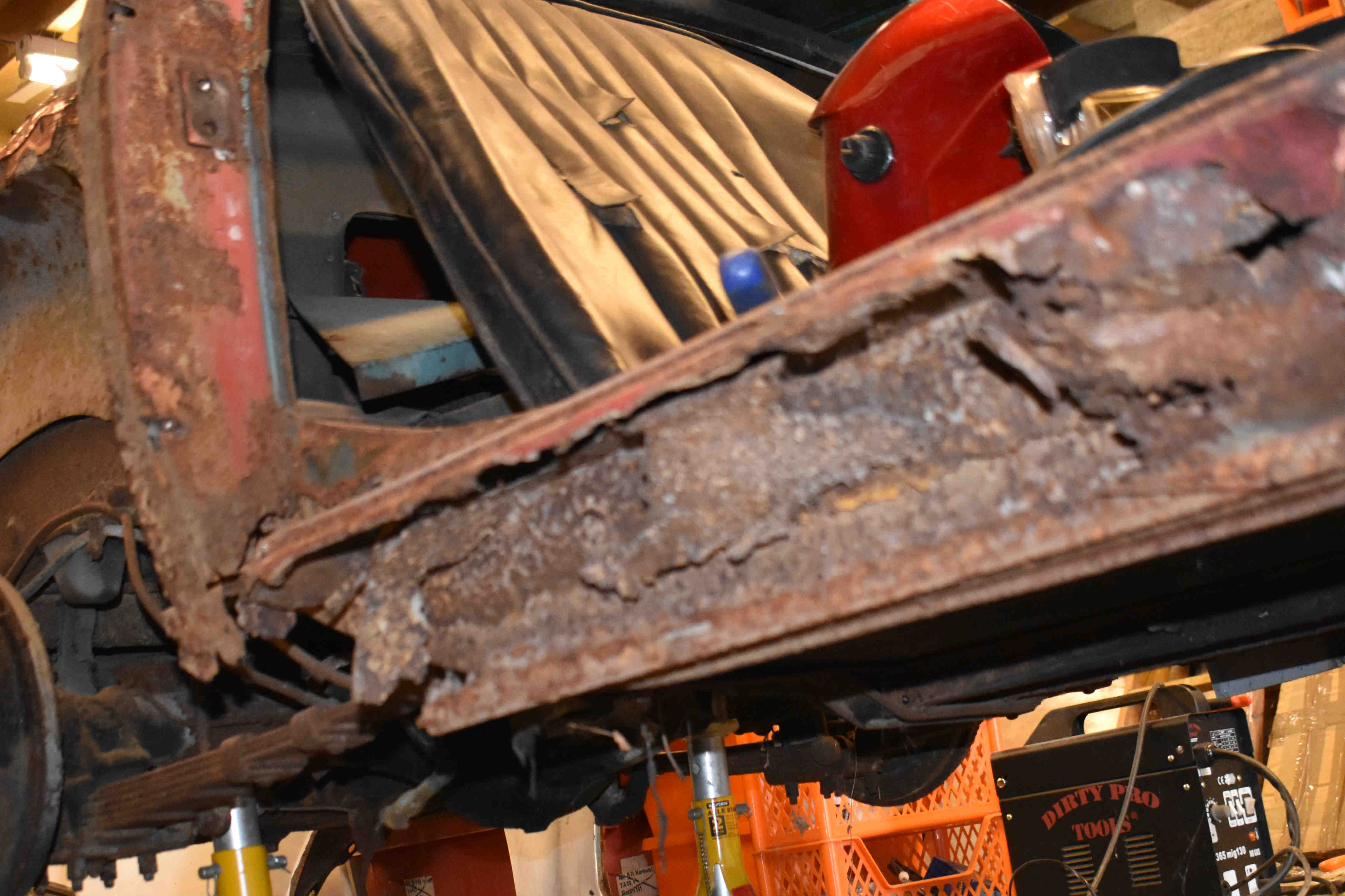 This side of the car looked in better shape than the nearside, or so I thought. Once let loose with the cutting grinder I realised that it only looked better as a cosmetic sill cover was covering up, well, not a lot, as there was virtually nothing left of the sill underneath - heaven knows what it was actually welded onto. In fairness, the bottom of the front inner wing was in better condition than the other side, requiring just a small patch.