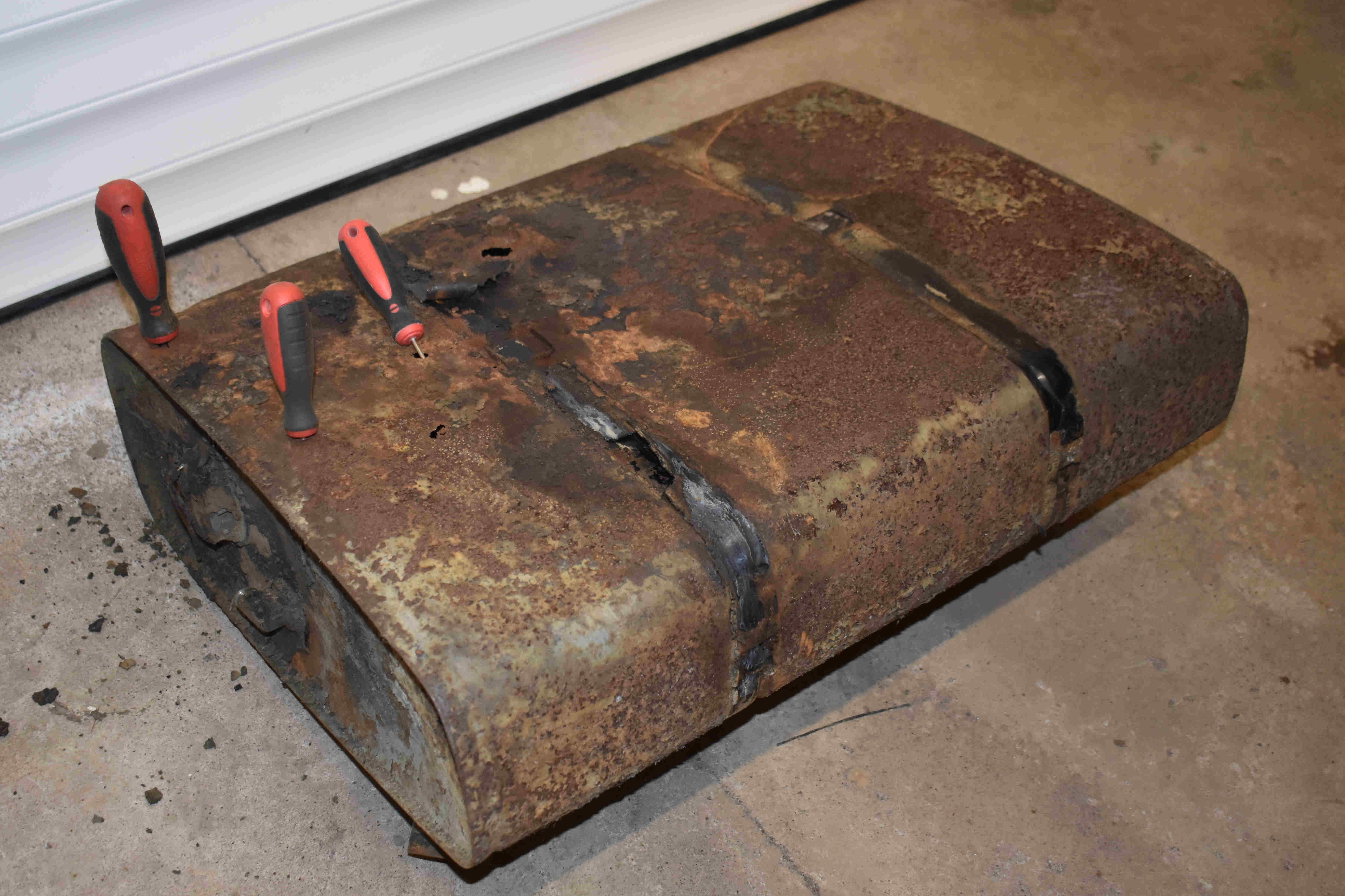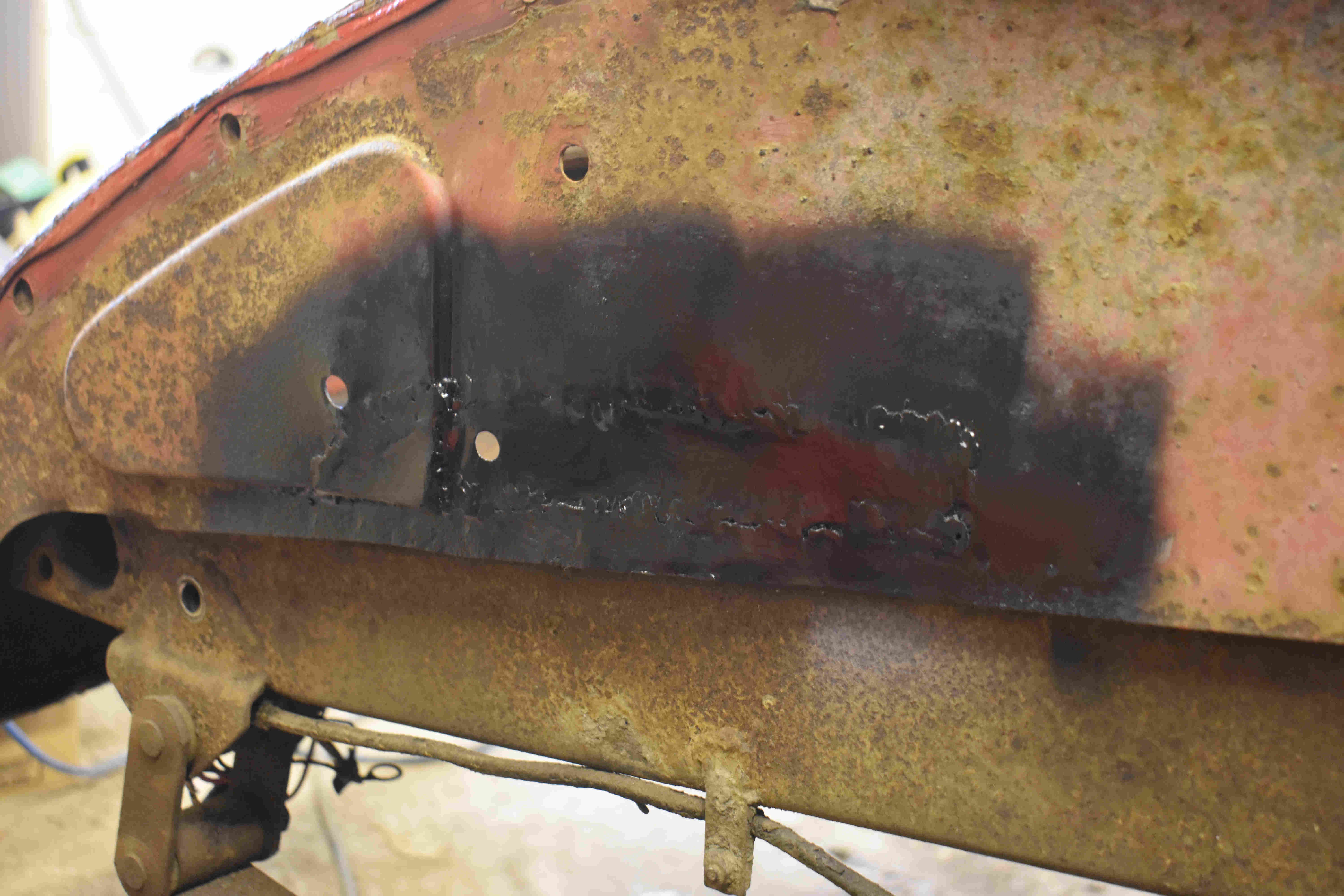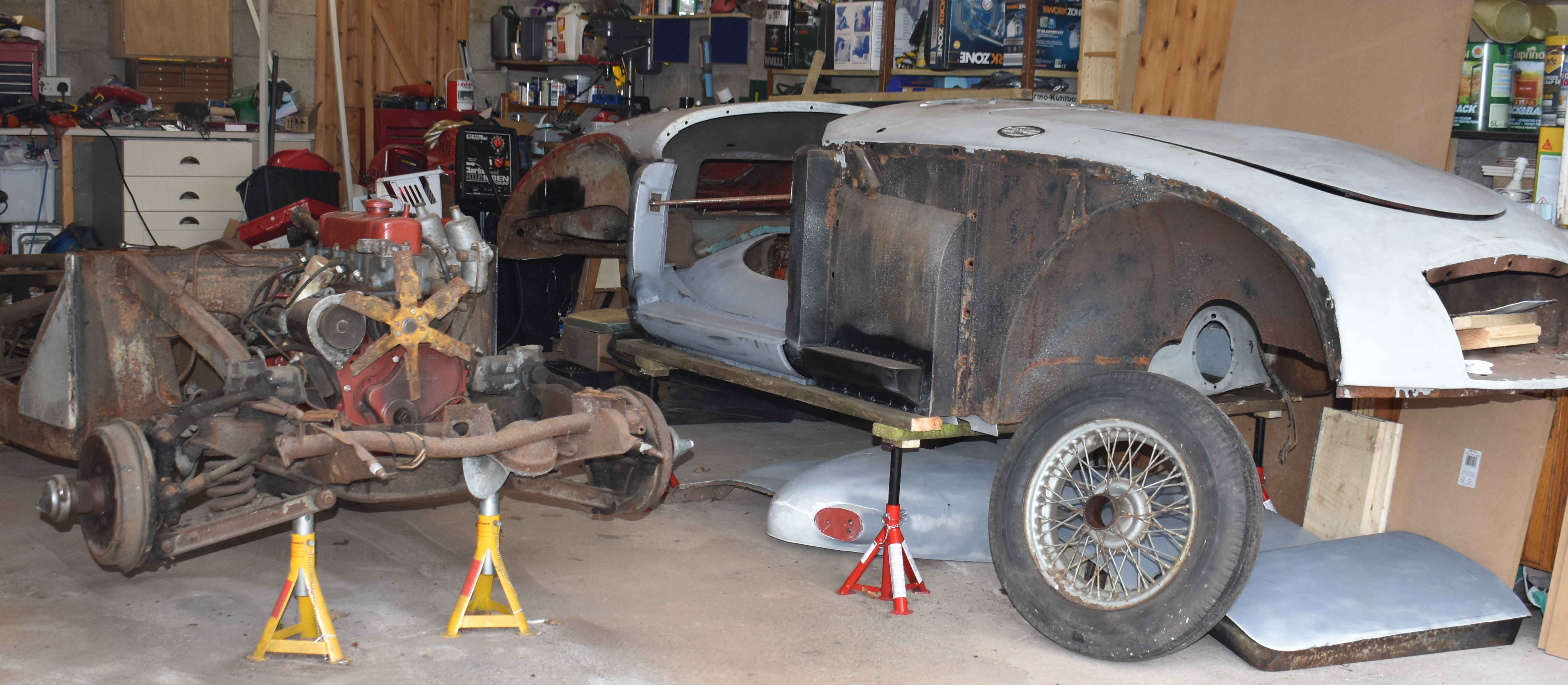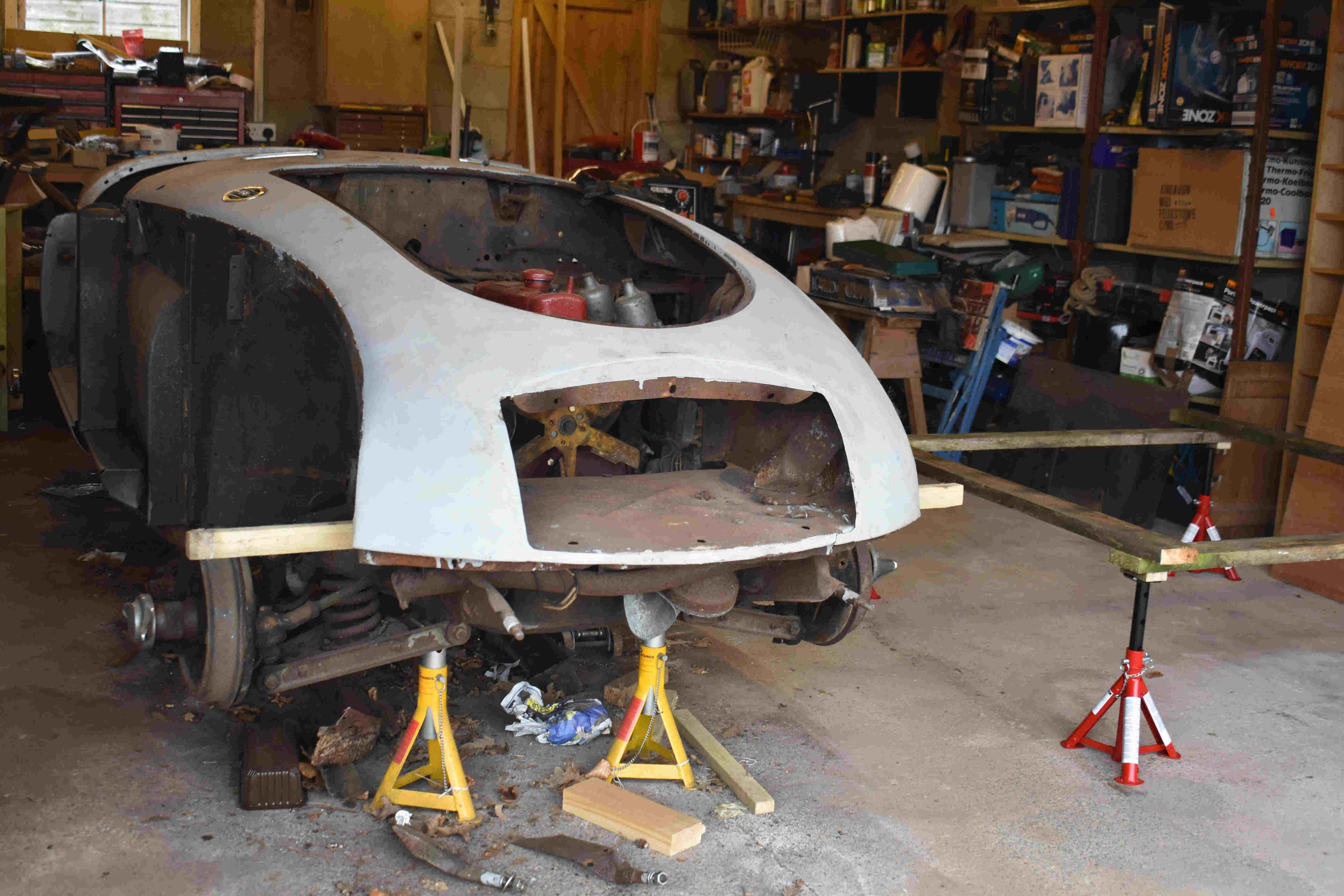 Once the sills were completed, things have moved on apace (due to lots of spare time in COVID-19 Lockdown). I made the decision that the next phase will be to strip down to the chassis, treat that, then rebuild literally from the ground up - it's not good having a rebuilt engine sitting around not being used and I don't want a newly restored body getting scratched during other work, so that's the plan. Before stating the body separation, there was a little rust hole on the rear inner wing /boot just above the wheel. Although the major body repair will be a later stage, I may as well do this as it is accessible and my welding gear is at hand. Of course the rust pin hole turned into a much bigger hole but I made up a repair panel and welded it in. I had visions of renovating the petrol tank once it was off, but all hope of that vanished once I saw the underside.
