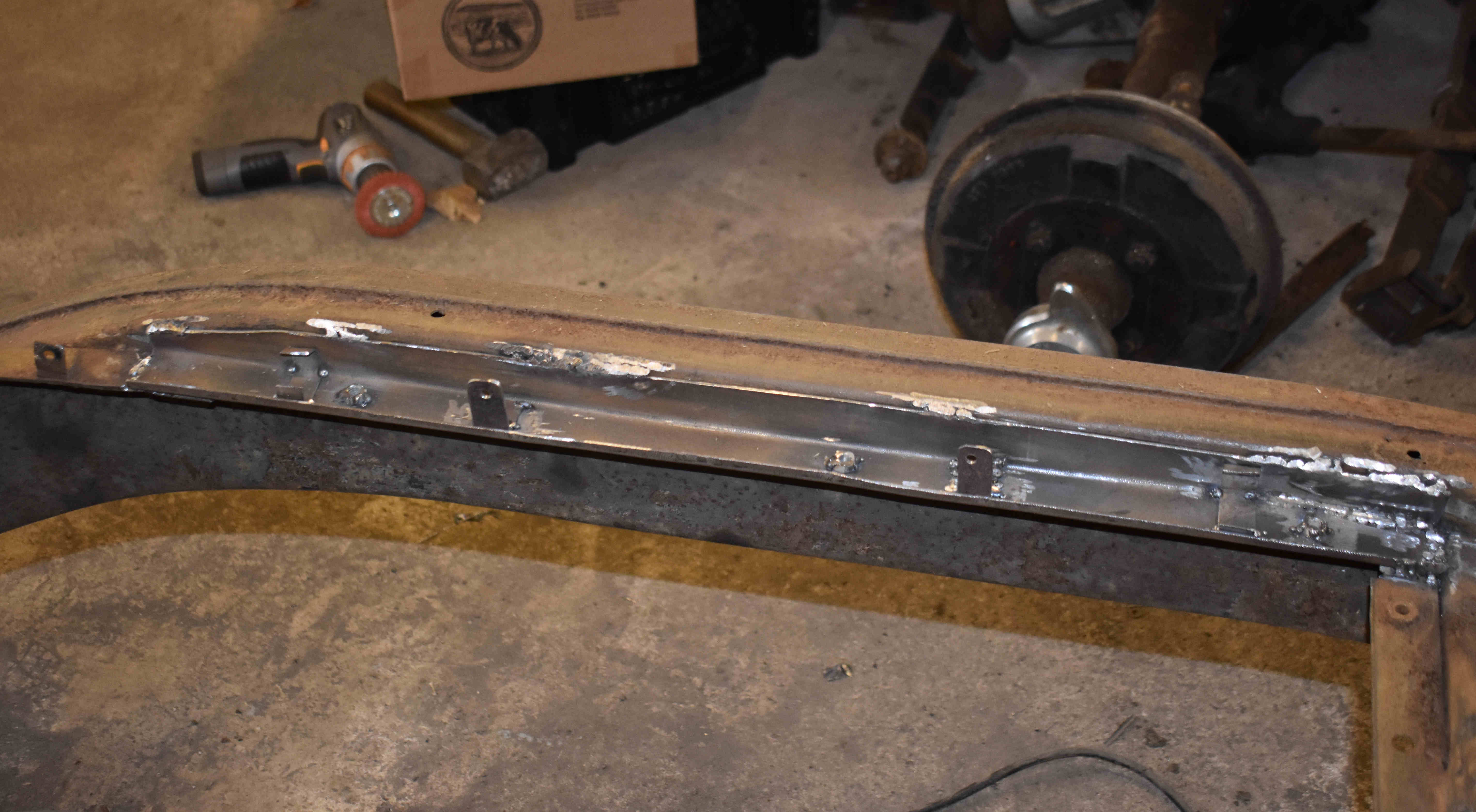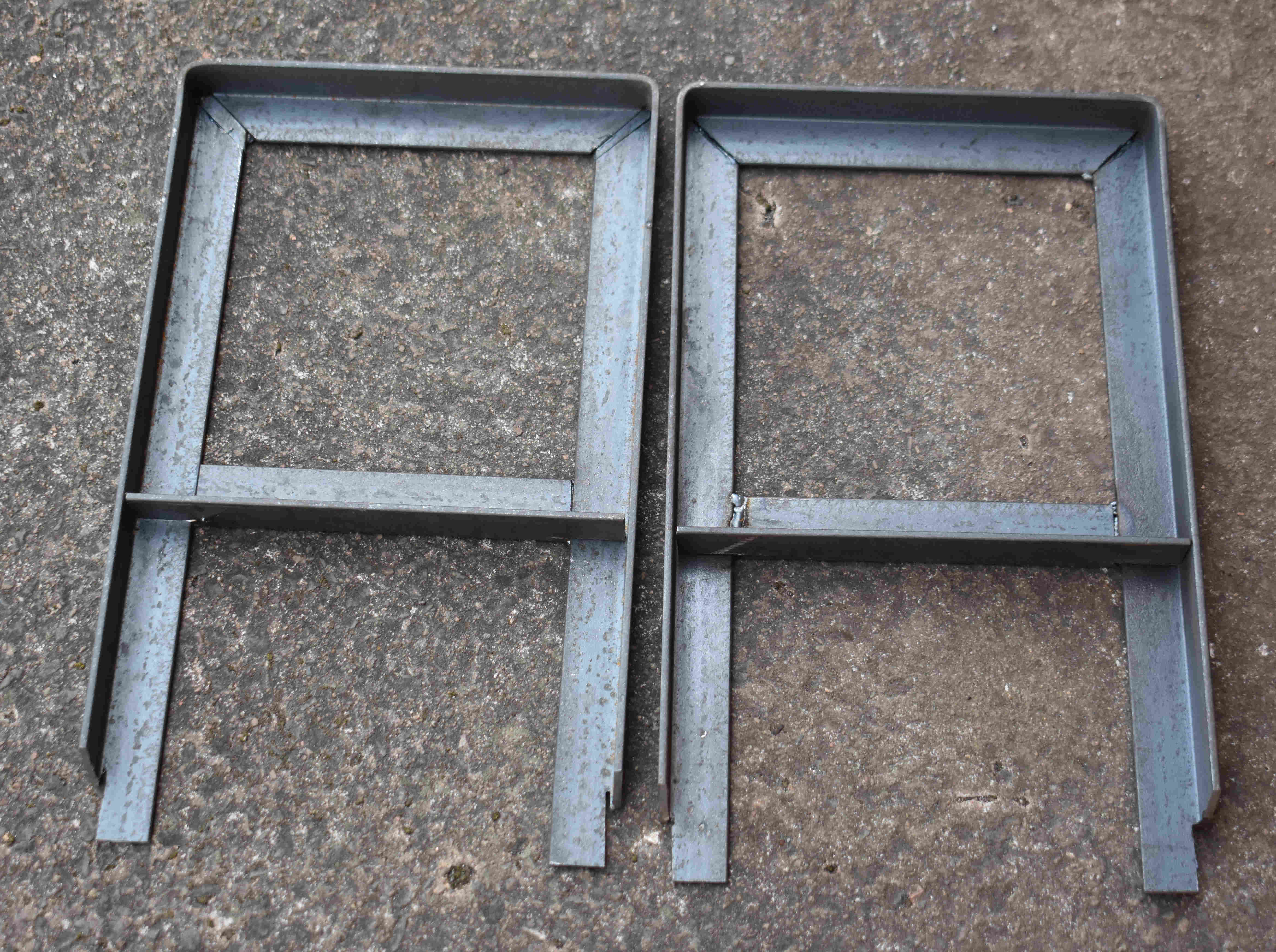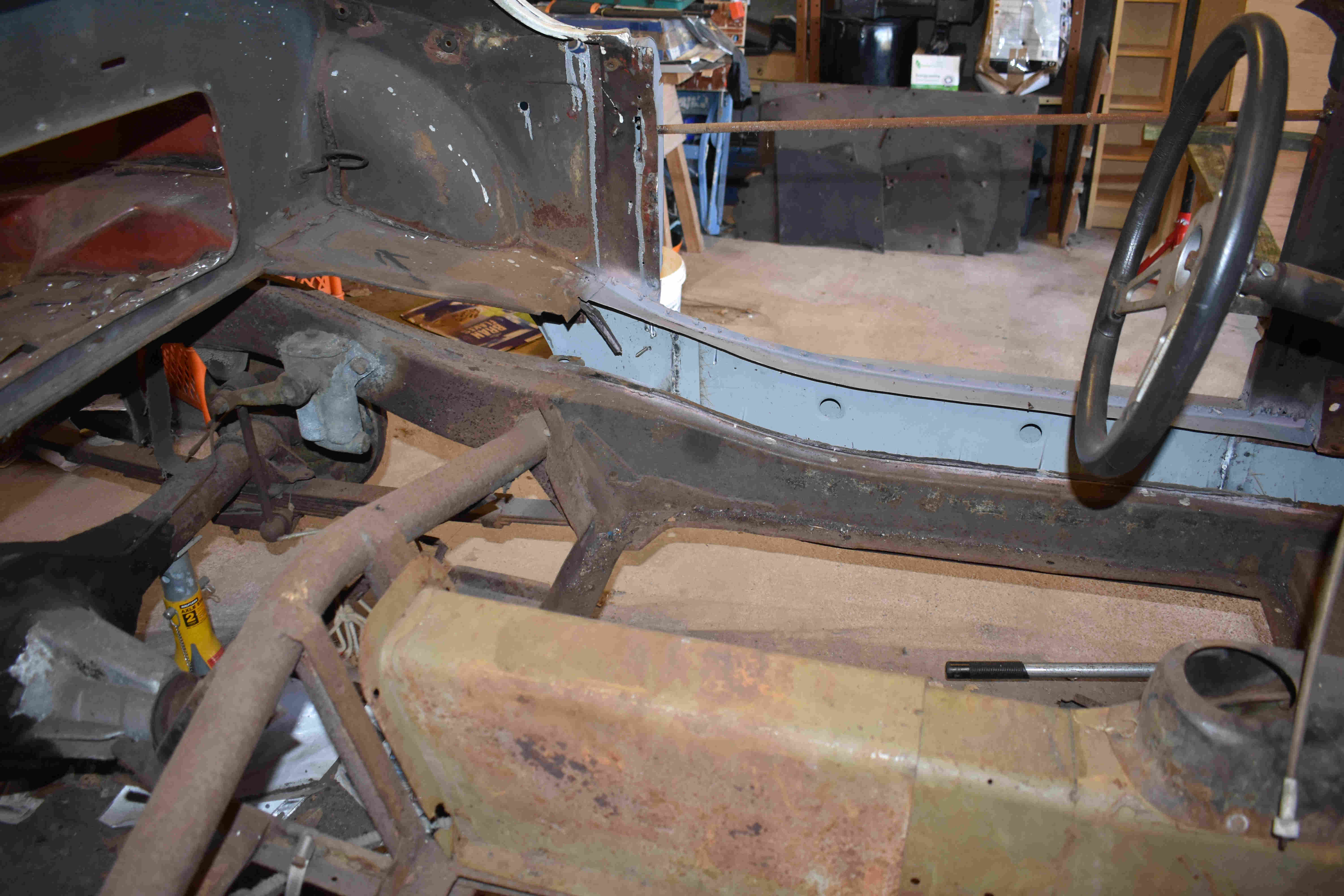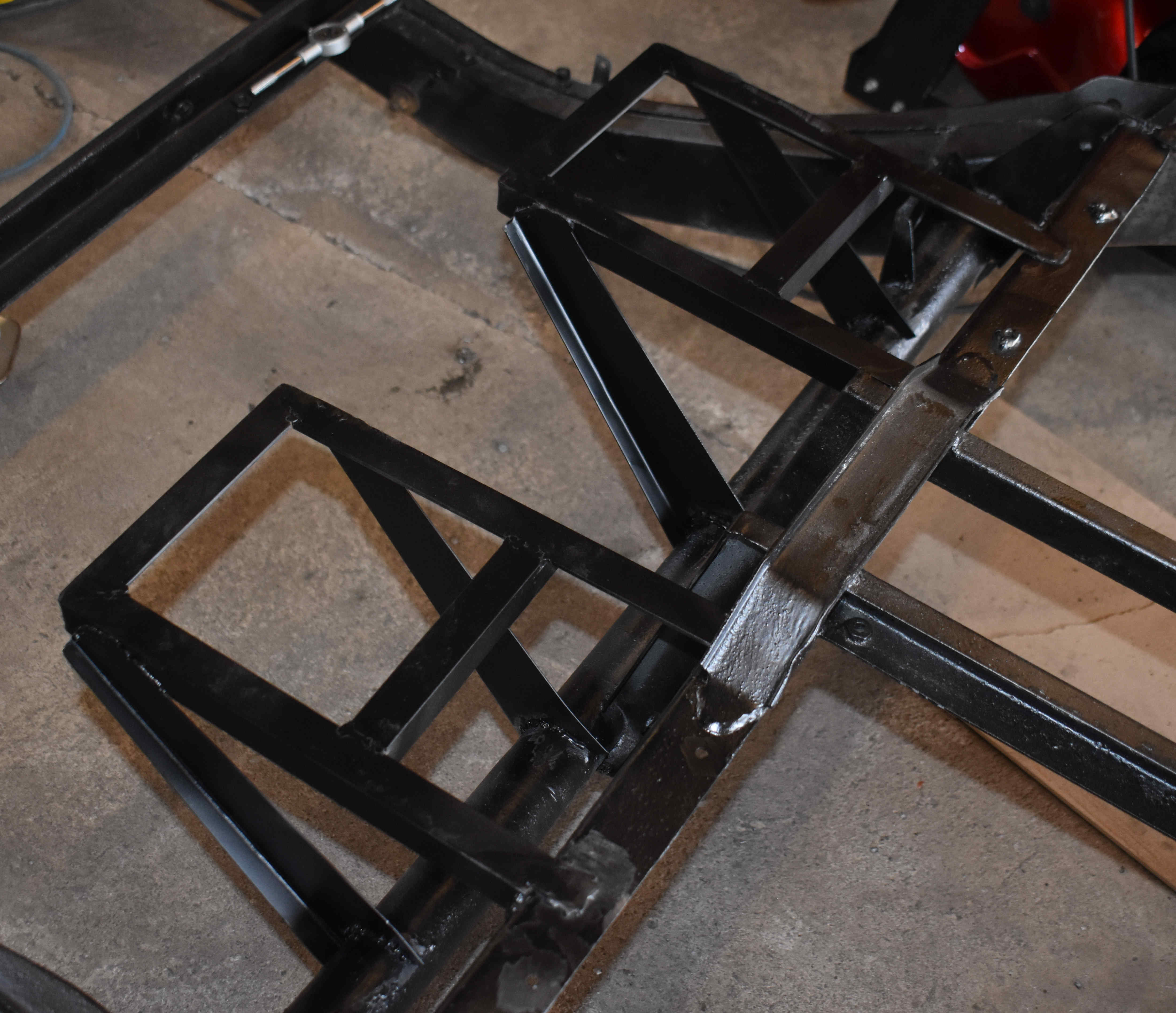 Apart from a bit of surface rust, the chassis appears in good fettle. Two replacement floorboard rails at the front and another for the lefthand side were made up out of 2mm sheet and welded in. Someone in the past had, presumably, replaced the floorboards but could not find the correct 1/4" UNC bolts so (anoyingly) drilled out the captive nuts to 6mm and affixed the boards with a nut on the underside - these have been ground out and the correct size welded in. New battery cradles are available, but at a price, so I made up a couple using 3mm angle iron - that's thicker steel than the originals but it only cost £10 in material (a tenth of the replacement cost) and won't rot quite as quickly.