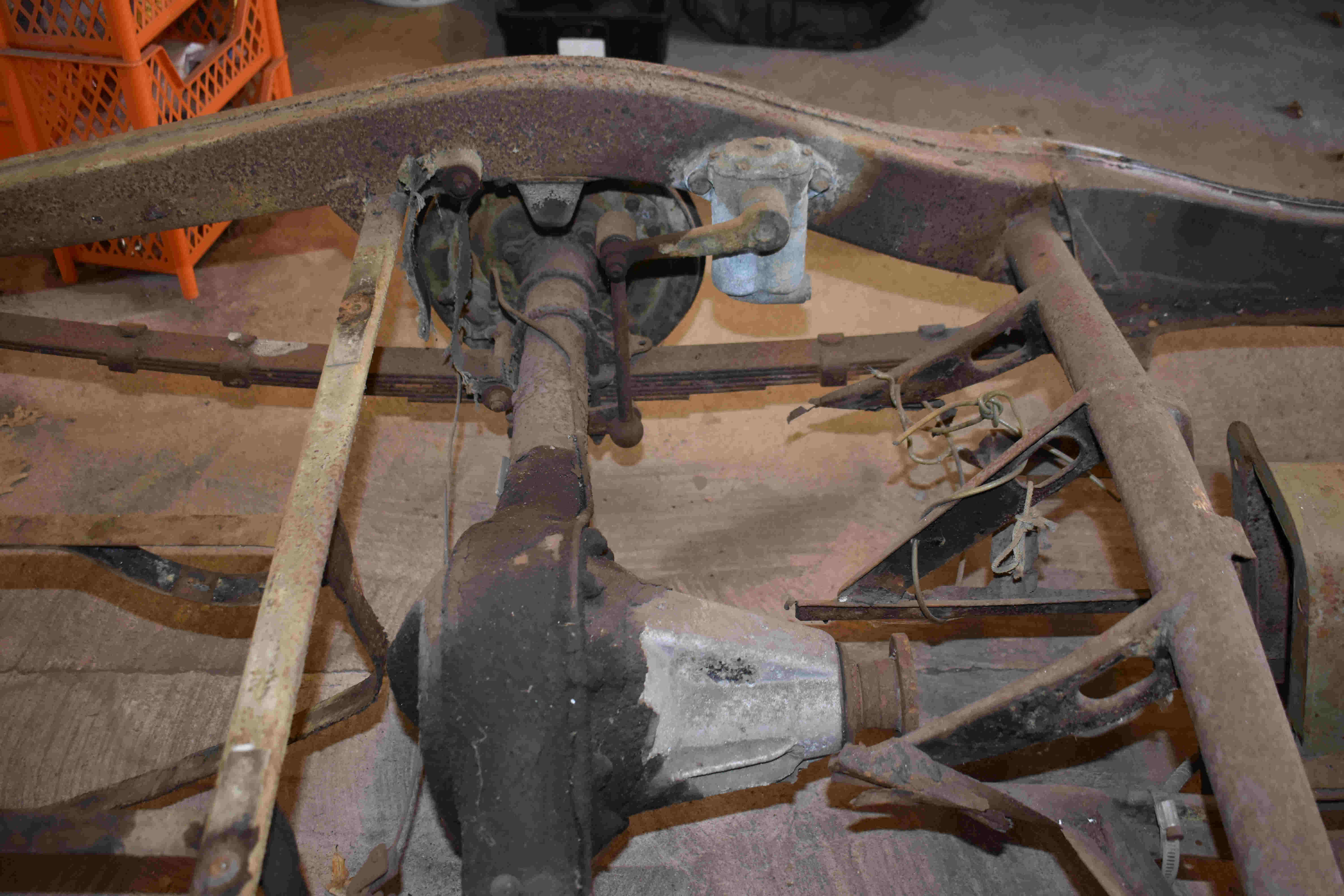 The rear axle came off with all bar one bolt (left spring eye bush) coming out after only gentle persuasion. A grinder and reciprocating saw made short work of the troublesome bolt that was corroded solid in the steel sleeve, and the axle assembly was free. The shock absorbers are shot but the axle and leaf springs seem in good condition.
